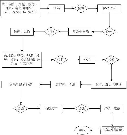 (10)構件經(jīng)工廠(chǎng)噴砂除銹合格后,噴刷完成底漆和中間漆。