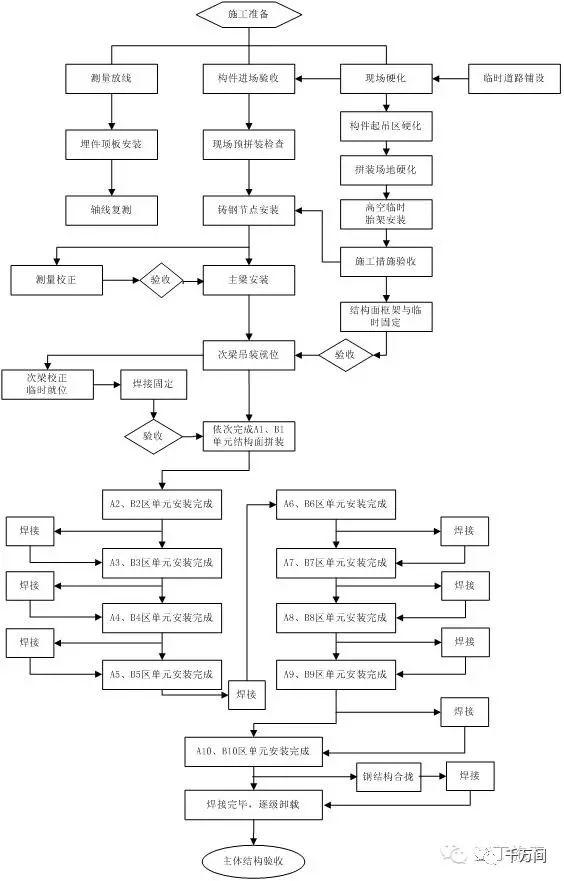 (9)吊裝耳板、臨時(shí)措施連接件、膜結構連接件以及其他專(zhuān)業(yè)需要在工廠(chǎng)進(jìn)行裝配焊接的連接件或二次結構,必須在工廠(chǎng)定位焊接完畢。