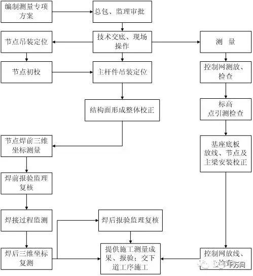 2)拼裝好的構件吊裝到位后,利用臨時(shí)支撐胎架進(jìn)行臨時(shí)固定,采用高精度全站儀進(jìn)行測量。
