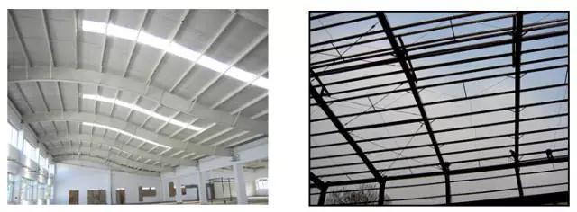 1.門(mén)式剛架屋面體系的整體性可以依靠檁條、隅撐來(lái)保證,從而減少了屋蓋支撐的數量,同時(shí)支撐多用張緊的圓鋼做成,很輕便。