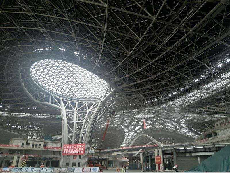 首先,我司參觀(guān)了航站樓屋面網(wǎng)架體系。該網(wǎng)架結構由8個(gè)巨型C形柱及周邊幕墻搖擺柱支撐,安裝時(shí)采用分塊頂升的方式,各區塊間通過(guò)條形采光天窗連成整體。航站樓屋頂面積達18萬(wàn)平方米,是世界上單體面積最大的屋面之一。其次參觀(guān)了航站樓核心區隔震體系。由于核心區結構超長(cháng)、超大,溫度作用顯著(zhù),同時(shí)航站樓核心區下部設有高鐵和地鐵車(chē)站,因此采用隔震技術(shù)。在核心區地下 1 層頂設置隔震層,使得整個(gè)核心區可以不設置溫度變形縫,能夠減少地鐵對上部結構的振動(dòng),使地震烈度降低一度。最后參觀(guān)了基于BIM的空間鋼結構預拼裝理論技術(shù)在工程中的應用,通過(guò)三維掃描技術(shù)將制作好的鋼構件三維坐標導入計算機內進(jìn)行預拼裝,省去了實(shí)體預拼裝流程,節約空間及時(shí)間。