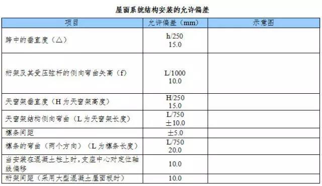 e.天窗架安裝可組裝在屋架上一同起吊。屋面系統結構安裝的允許偏差應符合下表規定。