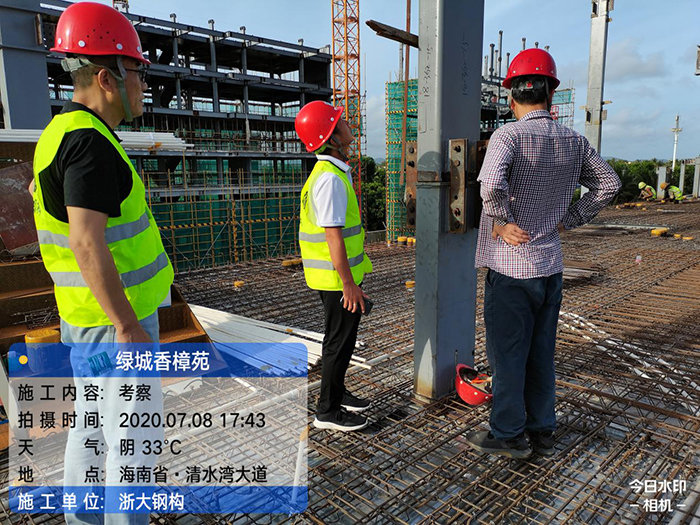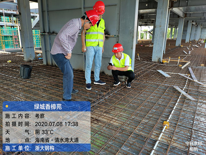 陳經(jīng)理向考察團大體介紹了香樟苑項目的工程概況和場(chǎng)地布置?疾靾F在21#樓和18#樓考察時(shí)分別詢(xún)問(wèn)了焊接、梁柱節點(diǎn)的施工工藝做法以及樓承板的施工工藝和工序,陳經(jīng)理針對考察團的疑問(wèn)進(jìn)行詳細解答,還重點(diǎn)介紹了本項目采用的專(zhuān)利-隱式鋼框架結構體系,裝配率滿(mǎn)足政府申報裝配式住宅要求、得分高、且造價(jià)可控?疾靾F高度認可我司隱式框架專(zhuān)利體系的優(yōu)越性,且對樣板展示間的鋼柱柱腳節點(diǎn)和二代樓承板的做法也頗有興趣。