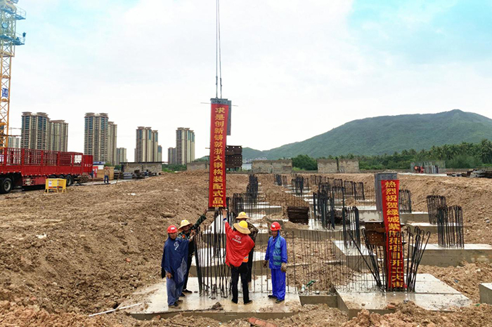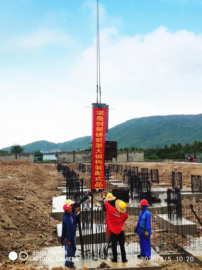 8月5日上午,由浙大鋼構承建的陵水綠城藍灣小鎮紫荊苑鋼結構項目首根鋼柱順利完成吊裝,紫荊苑項目正式開(kāi)工。