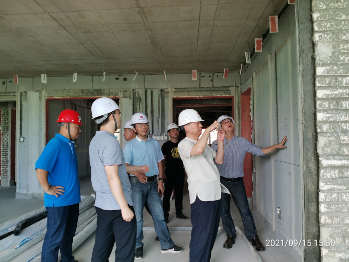 考察團先參觀(guān)了香樟苑住宅項目:項目由19棟鋼結構裝配式住宅樓組成,已于2020年11月完成主體結構封頂,現精裝修已經(jīng)處于收尾階段,預計年底精裝交房。領(lǐng)導團考察了項目的22#樓3層、1#樓3層,分別以鋼結構鋼梁填充、裝配式內墻板與鋼柱交接、精裝修處理做法等節點(diǎn)進(jìn)行了討論交流。