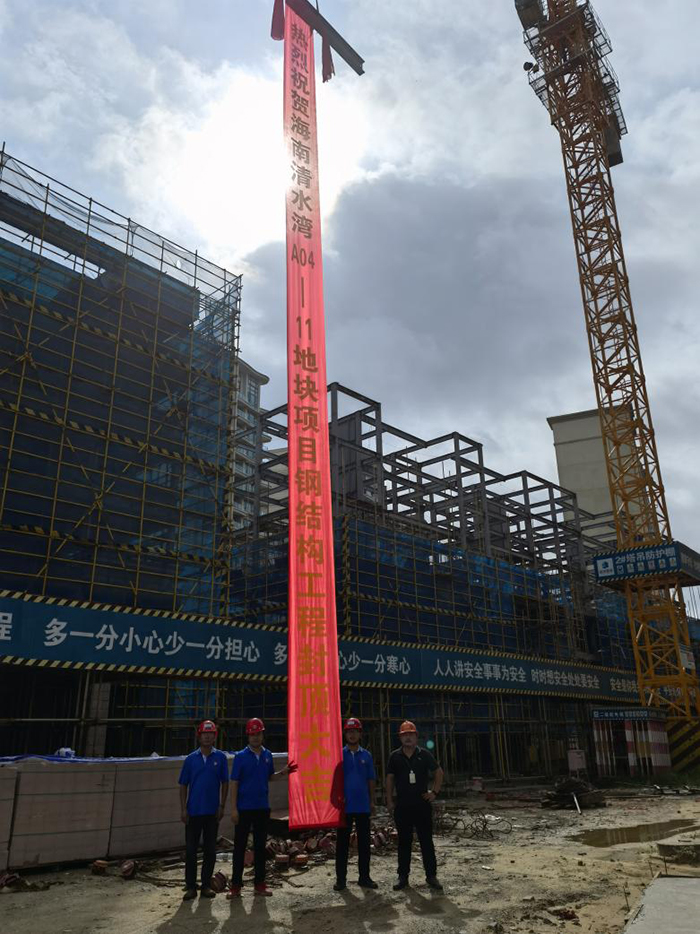 2022年6月11日上午9:00,由海南浙大鋼構有限公司承建的海南清水灣雅居樂(lè )A04-11地塊鋼結構裝配式住宅項目順利封頂。歷經(jīng)多個(gè)日夜的辛苦努力,終獲成果,建設單位吳工與我司項目經(jīng)理楊學(xué)文、周杰等共同見(jiàn)證,分享喜悅。