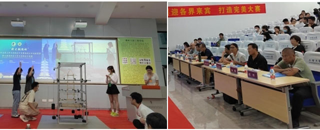 本賽題以應縣木塔為背景,以三重木塔結構為基本單元,讓參賽者針對多種荷載工況下的空間結構制作帶挑檐加載點(diǎn)的三層木塔結構。經(jīng)過(guò)共計16個(gè)小時(shí)的模型制作,模型加載暨決賽于3日在海經(jīng)院工程樓副樓F101進(jìn)行,參賽現場(chǎng)井然有序,各參賽者在主持人播報序號和志愿者指引下帶模型到加載區進(jìn)行安裝、加載。由國內業(yè)內專(zhuān)家和各參賽高校結構專(zhuān)業(yè)高級職稱(chēng)教師代表組成現場(chǎng)評審專(zhuān)家委員會(huì )進(jìn)行提問(wèn)、評分。