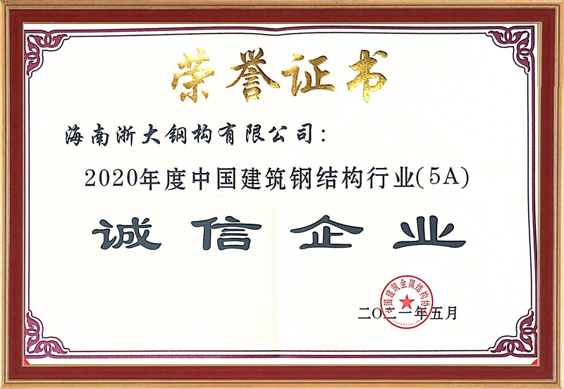 2020年度中國建筑鋼構行業(yè)(5A)誠信企業(yè)